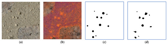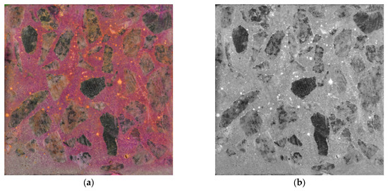 The concrete samples were pretreated with several reagents to increase the contrast of various concrete components. The 1% solution of phenolphthalein C20H14O4 of reagent grade purity (Sphera Sim, Lviv, Ukraine) and the 5% solution of sodium hydroxide NaOH (Sphera Sim, Lviv, Ukraine) were used. Contrasting calcium carbonate (orange chalk) was used to fill the air voids. Next, the filler (chalk) was removed from the smooth surface of the concrete section. Thus, the contrasting filler remained only in the air voids and areas around the aggregates. This allowed for the enhancement of the visibility of air voids in the images maximizing the distinction between filled voids and background and prevent intensity overlaps between voids and aggregates and further application of an image segmentation technique. When processing an image of a surface of a concrete test specimen, the RGB image model was used. This model allows us to process the image’s red, green, and blue channels separately. The R image component of the RGB colour model was the most relevant for detecting voids, so it was used for further processing. In Figure 7, the initial image of the surface of a 10 × 10 cm concrete test specimen of C30 grade (a), as well as its red R (b), green G (c), and blue B (d) components of the RGB colour model are shown. If necessary, before applying the segmentation stage directly, in some instances it is advisable to perform pre-processing of the image to increase its contrast, improve its quality [64], restore colours [65], and highlight contours [66].