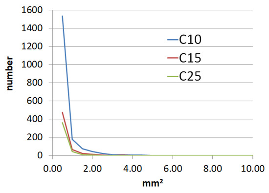 The results of the experiments are shown in Figure 8 and Figure 9. In particular, Figure 8 shows the input images (a), (d), and (g) of C10, C15, and C25 grades, respectively, and the results of segmentation of cement stone (background) and voids (object) by known adaptive thresholding method [72]—(b), (e), (h) and by our method proposed in Section 3.3—(c), (f), (i). Figure 8 shows graphs of the void size distribution for test samples of concrete of different grades—C10, C15, and C25. The average percentage of voids by cross-section of test concrete cube, the average rate of aggregate, and the average compressive strength of concrete according to experiments are shown in Table 5.
