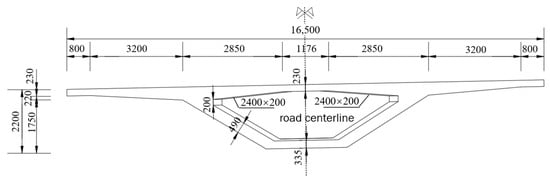 The concrete strengths of the deck slab and the entire bridge were 54.1 MPa and 56.6 MPa, respectively. We used the empirical equations to calculate the concrete’s elasticity modulus according to China’s highway bridge design specification []. These values were 0.52 × 10 4 MPa and 3.55 × 104 MPa, respectively, for the deck slab and the entire bridge within the FWD’s area of impact.