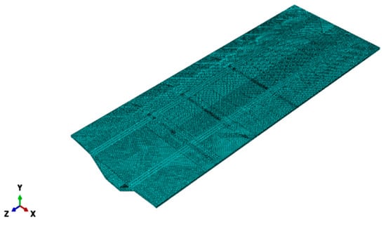 ABAQUS 2021 software was used to establish the finite element model of the bridge, and the main girder, asphalt, and prestressing tendons were modeled with C3D8R and T3D2 elements, respectively []. Structured mesh delineation was used, and the irregular area of the model was divided to obtain a finer mesh. Global seeding was used, and the beam segments were locally refined. The grid size was 0.2 × 0.2 m at the measurement points of the FWD and 0.1 m on the main span of the asphalt pavement. Grid encryption was used for the concrete beam. The model consisted of 301,820 nodes and 204,635 cells. The finite element model of the box girder bridge is shown in Figure 3.