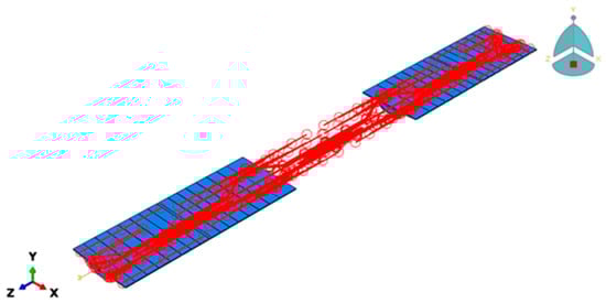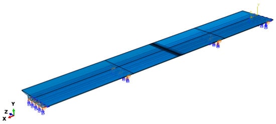 The X-direction of the model was the cross-section direction, the Z-direction was the travel direction, and the downward Y-direction was the bridge’s depth. We used the cooling method to apply the prestressing force and embedded units in the interaction module to simulate the interaction between the prestressing tendons and concrete and ensure high computational efficiency []. The interaction model between the prestressing tendons and concrete is shown in Figure 4. Since the bridge was a continuous girder bridge, the bottom surface of block 0, which was cast in place, in the middle span was in contact with the abutment, resulting in full constraint. The remaining bearings were unidirectional movable bearings to constrain the displacements in the X- and Y-directions and the rotation in the X- and Z-directions []. The 3D model of the bridge is shown in Figure 5.