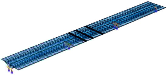 The span of the bridge was 20.62 m + 33.0 m + 25.5 m, with a length of 79.12 m. The bridge cross-section was 12.75 m wide. It had a single box and three chambers. C50 concrete was used for the superstructure, C30 concrete was utilized for the substructure, and the thickness of the decking was 0.1 m. Finite element analysis software was used to establish a dynamic finite element model of the bridge. The X-axis was the travel direction, the Y-axis was the longitudinal direction, and the Z-axis was the transverse direction of the bridge. The global grid size was 0.2 m. The grid was refined (0.1 m) and encrypted within the range of the FWD measurement points to improve the computational accuracy. We used 202,458 nodes and 132,472 elements. The material parameter values were based on the design data. The modulus of elasticity of the deck slab and the entire bridge was 3.65 × 104 MPa, the Poisson’s ratio was 0.2, and the density was 2.42 g/cm3. The tensile stress of the prestressed tendons was 1395 MPa. The boundary conditions of the model were based on the constraints of the girder bridge (Figure 10).