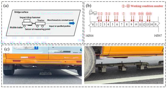 Falling weight deflectometer (FWD) test: (a) Diagram of the inspection program; (b) Schematic of the working conditions at the FWD measurement point; (c) Schematic of the FWD test vehicle.