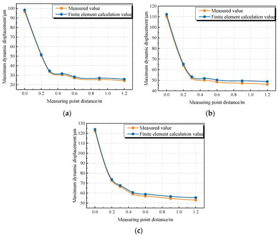 Three groups of data were randomly selected to calculate the maximum dynamic responses under the working conditions using the dynamic finite element method. The calculated and measured maximum dynamic responses are shown in Figure 7 and Table 4.