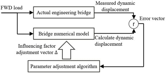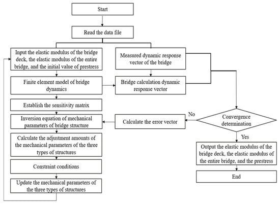 A system identification method was used to approximate the bridge system by establishing a mathematical model. It uses the input load and output response data to invert the structural damage parameters. The first step was to determine the initial values of the bridge’s physical parameters using engineering examples and a priori knowledge of the damage. The initial values of key parameters, such as the elasticity modulus and the prestress loss, were used to provide a benchmark framework for establishing the model. A mechanical orthotropic simulation was carried out using the finite element model to calculate the theoretical dynamic responses under the impact load and establish a relationship between the parameters and the dynamic behavior. The parameters were adjusted dynamically after a perturbation-based update to reduce the deviation between the theoretical and measured responses. Matrix decomposition was used for multi-parameter optimization until the convergence criterion was reached. The validity of the inversion results was determined using the model’s prediction accuracy. If the error exceeded the threshold, the iterative correction was repeated until the output parameters optimally matched the responses of the real system []. This closed-loop process integrated parameter initialization, forward calculation, dynamic optimization, and accuracy verification, resulting in a damage identification method with high levels of theoretical rigor and engineering practicality. The error between the model-derived and measured results was minimized using parameter adjustment algorithms. A flowchart of the system identification method is shown in Figure 8.