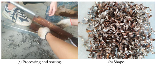 The waste steel fibers used in the test were obtained from mechanically processed filaments with a three-dimensional spiral shape. Due to the different lengths of the WSFs, they were cut into finished products with a length of 10–30 mm, with an average length of 25 mm, and then rust and oil stains were removed and they were dried for use [51]. After measurement, the average size of the waste steel fibers was 0.36 mm (thickness) × 2.68 mm (width), the average tensile strength was 385.3 MPa, and the elastic modulus was 2.02 × 105 MPa. The volume contents of waste steel fiber in concrete were 0, 0.5%, 1.0%, and 1.5%. The sorting process and shape of the waste steel fibers are shown in Figure 1.