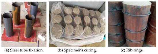 A total of 17 ERWCFST and 1 high-strength external steel rib ring restraint waste-steel-fiber-reinforced concrete filled steel tube (HERWCFST) columns were designed. The steel tubes were processed by laser cutting, which can ensure the flatness of both ends and prevent the leakage of concrete during pouring. The processed steel tubes were bonded with the bottom plate by hot-melt adhesive, and then the concrete was poured inward. When pouring concrete, the stirring rod was inserted and compacted. The specimens were placed in a dry and cool place, and the top of the concrete-filled steel tubes was covered with plastic film [52]. The specimens were cured under natural conditions for more than 28 days until the concrete reached the design strength, and the external rib rings were welded. Figure 2 shows the production and curing of the specimens. The specific design parameters of each specimen are shown in Table 4.