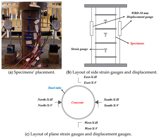 The test was carried out on the YAE-10000 (10 MN) electro-hydraulic servo long column pressure testing machine, and the plate hinge was used for loading. Displacement sensors and 30 mm thick steel pads and acrylic plates were placed on the pads and specimens, and the loading device is shown in Figure 3. The test equipment included the electro-hydraulic servo long column pressure testing machine, a DH3818-2 static data acquisition box, a displacement sensor, a dial gauge and computer, and so on.