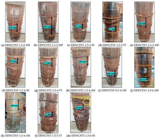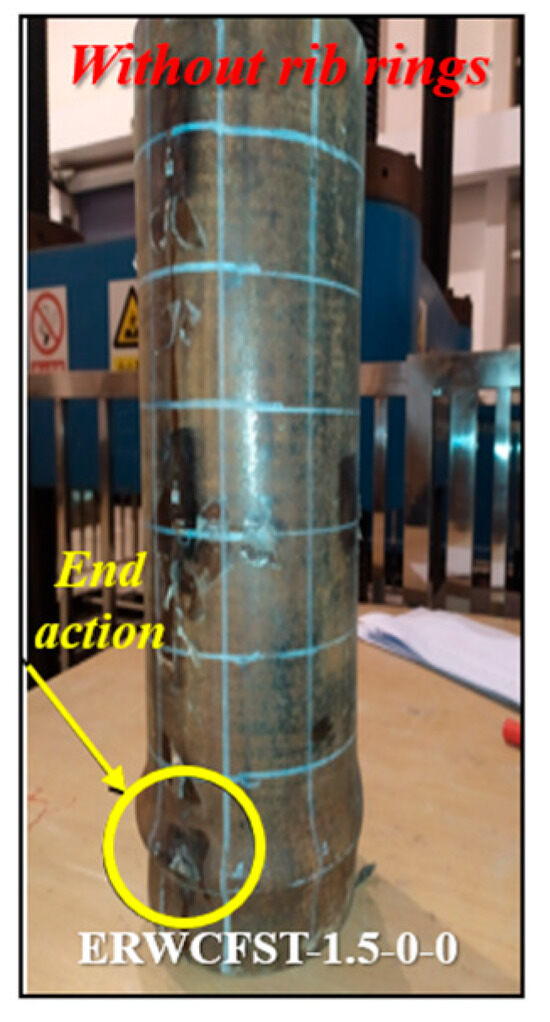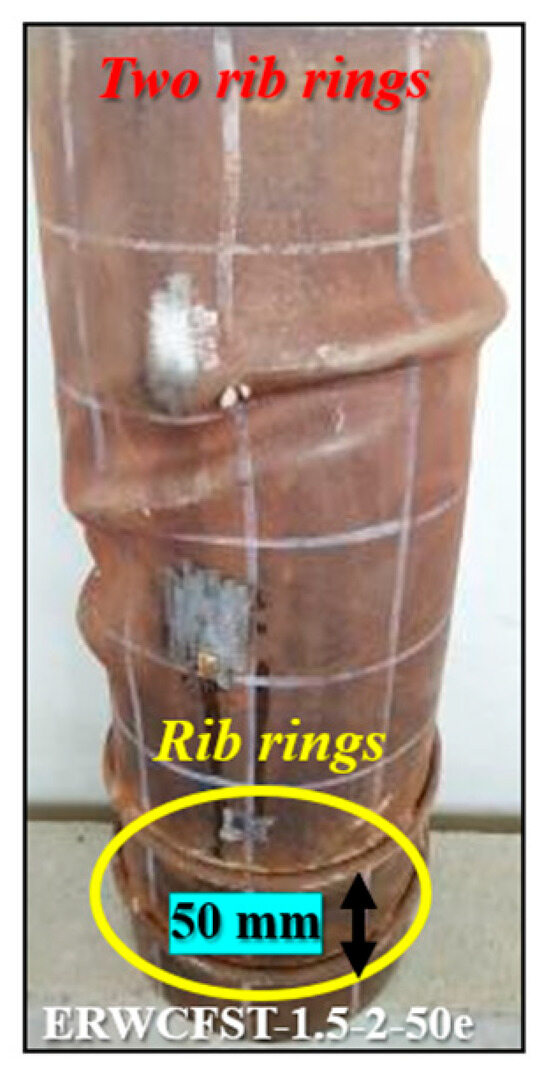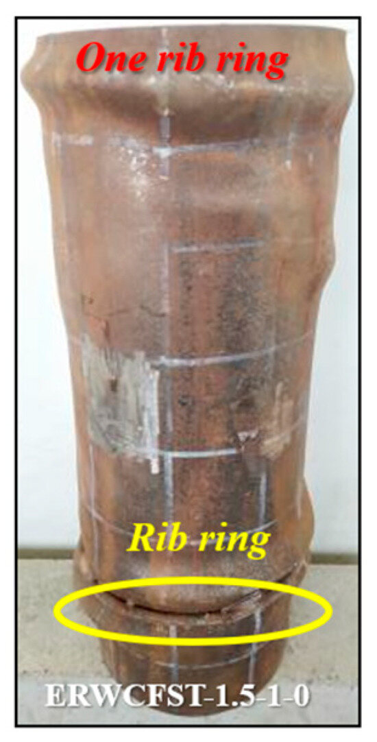 ERWCFST-1.5-1-0 showed obvious buckling failure, and the buckling position mainly occurred in the middle and bottom, without lateral restraint. The effective lateral restraint was provided at the steel tube with the additional rib ring, which limited the development of bulging and made the buckling occur at the upper and lower parts of the rib ring. Under large axial deformation, the concrete expanded and squeezed laterally after crushing, resulting in buckling of the steel tube.