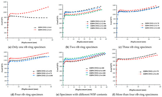After the elastic–plastic stage, the concrete column was constrained by waste steel fibers, and the crack development was limited. The steel tube and concrete re-entered the common working stage; that is, the column entered the strengthening stage. After reaching the peak load, the steel tube could not provide effective lateral restraint for the column without rib rings, because the core concrete reached the ultimate strain. Therefore, after the specimen ERWCFST-1.5-0-0 reached the peak load, the load continued to decrease with the increase in displacement until the specimen failed, as shown in Figure 8a. After the columns with rib rings reached the peak load, the load in the elastic–plastic stage decreased slightly. Because the rib rings set on the outer surface of the steel tubes began to provide effective lateral restraint for the steel tubes, they limited the development of the surface buckling of the steel tubes, enhanced the axial bearing capacity of the specimens, and limited the fracturing and lateral expansion of the concrete. The steel tubes finally entered the strengthening stage, so the bearing capacity increased with the increase in compression deformation until the specimen was destroyed, as shown in Figure 8b–f.