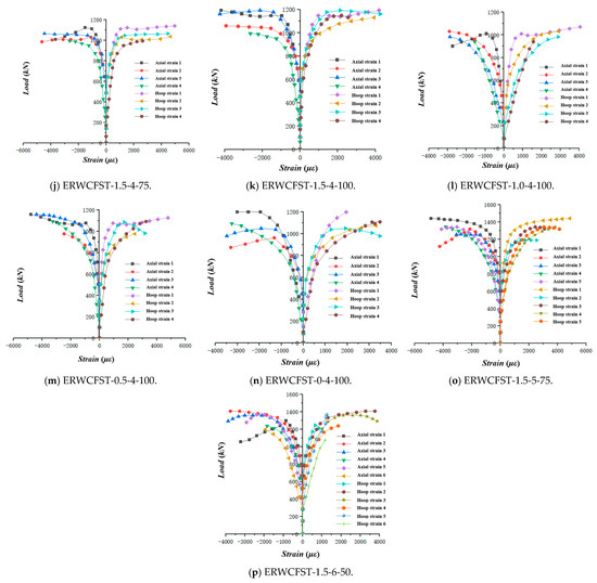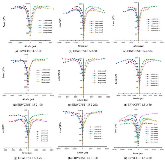 The axial and hoop load–strain curves of the steel tube columns are shown in Figure 9. It is stipulated that the hoop tensile strain is positive and the axial compressive strain is negative. In the early stage of loading, the influence of the rib ring constraints on the strain of the components was not obvious, and the development trends of the load–strain curve of each specimen were similar. After the axial compression load reached the peak, there was a significant difference in the strain of the specimens with and without rib rings. After the peak load, the strain curve of the specimen without rib rings continued to decline rapidly, and the decline period of the curve was very short. However, after the peak load of the specimens with rib rings, the bearing capacity of the column decreased briefly and then entered the strengthening stage quickly; that is, the bearing capacity and ductility of the column were improved.