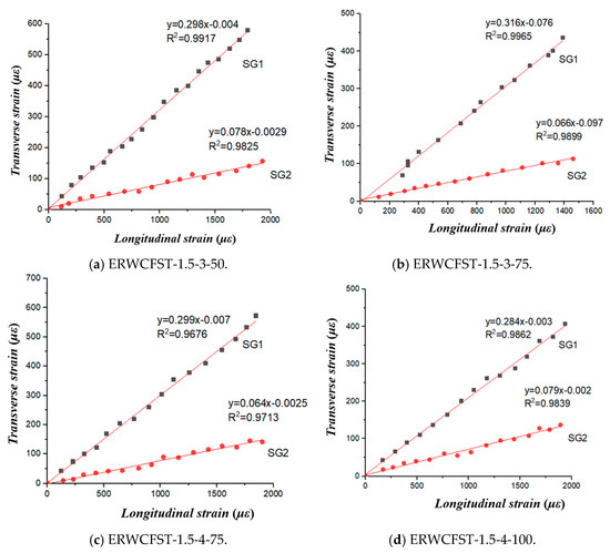 In order to study the performance of the steel outer rib-ring-reinforced interface bonding and enhanced resistance to axial strain, the transverse deformation of the two materials was determined by summarizing and calculating the data of the strain gauges attached to the surface of the steel tube SG1 and the steel rib ring SG2. In order to ensure the accuracy of the test, the average value of the strain on the surface of the steel tube and the steel rib ring was used. The slope of the longitudinal and transverse strain curves in the initial elastic stage was used to represent the Poisson’s ratio of the sample; that is, εh/εv.