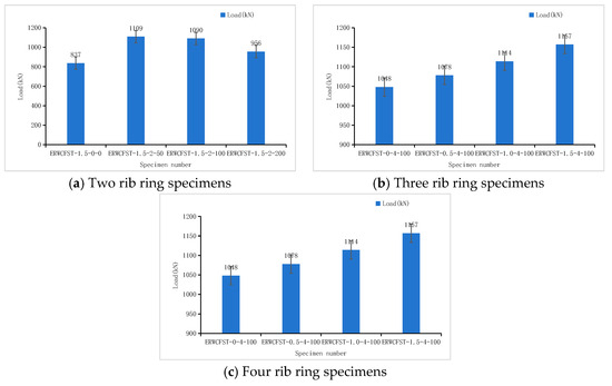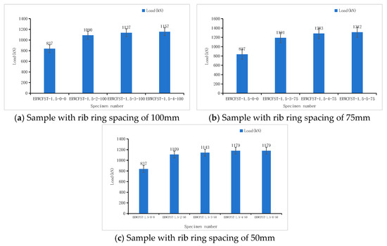 Because the rib rings provide effective lateral restraint to the steel tube, the restraint effect on the specimens is different when the rib rings’ spacing is different. The rib rings provide effective constraints on the easily damaged ends and middle–upper parts of the column, the interface bonding and stress distribution of the specimens are more uniform, and the bearing capacity is improved more significantly.