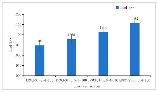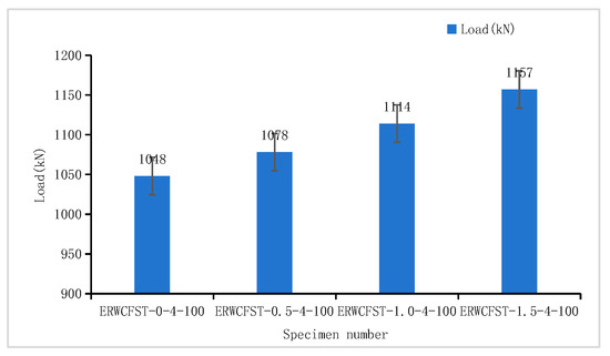 The bearing capacity curves for different numbers of rib ring constraints are shown in Figure 11. It can be seen from the figure that the bearing capacity increases linearly with the increase in the number of rib rings. When the spacing of the rib rings is constant, the bearing capacity of the columns with different numbers of rib rings is 32.5%, 21.98%, 24.61%, 40.86%, and 53.17% higher than that of the column without rib rings, respectively. Among them, the maximum increase rate of column ERWCFST-1.5-6-50 was 53.17%, with an average increase of 37.78%. Compared to the column without rib rings, the bearing capacity of ERWCFST-1.5-5-75 increased by 42.29%. Relative to the column with four rib rings, ERWCFST-1.5-5-75 exhibited the highest increase in bearing capacity, reaching 56.75%. In contrast, the maximum increase rate of ERWCFST-1.5-4-100 was 38.23%, with an average increase of 34.77%.