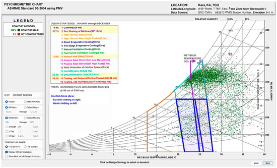The Kara region, located in northern Togo, is one of the country’s five regions. According to the coordinates of the WGS84 global ellipsoid, the Kara region lies between 9°25′ and 10°10′ north latitude and between 0°15′ and 1°30′ east longitude (Figure 2). It covers a total area of 11,490 km2, which is equivalent to about 20.50% of the national territory [8]. The Kara region is bordered to the south by the Central region and to the north by the Savannah region. It also shares borders with Ghana to the west and Benin to the east. The Kara region is characterized by a humid tropical climate of the Sudano-Guinean type, with an alternation between a dry season extending from November to March and a rainy season for the rest of the year. The region has an average annual rainfall of between 1000 and 1500 mm (Figure 3), with insignificant local variations. Average monthly temperatures in the Kara region range from 25 °C to 31 °C (Figure 4) [8]. Figure 5, from Climate Consultant version 6.0, illustrates the psychrometric diagram that outlines the different design strategies recommended to ensure optimal comfort in the Kara region.