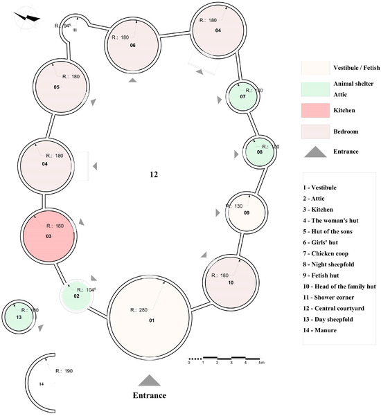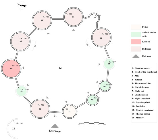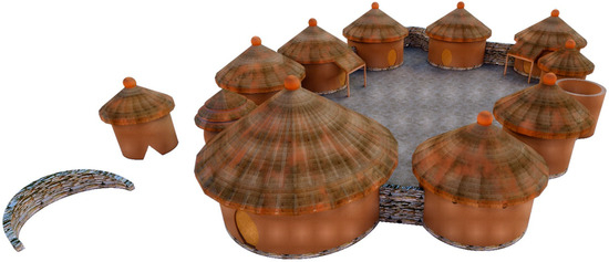 The Kabiyè people are the predominant ethnic group in the Kara region [35]. The Kabiyè reside mainly in the mountains of the prefectures of Kozah and Binah. The KVA is dispersed due to the people’s management of agricultural land, with an average distance of 50 to 100 m between dwellings in a neighborhood. The buildings barely emerge into the landscape and remain identifiable thanks to the preserved trees nearby, which provide them with shade. People often construct KVA on valley peaks and slopes to enhance occupant safety [36]. The KVA serves three main functions: first, it is a dwelling place for both the living and the spirits, but it also serves as a refuge for animals and a reserve of crops [36]. The KVA consists of round huts, separated from each other and organized in an almost circular unit. The walls of the huts are made of beaten earth, topped with a conical straw roof, overflowing on the perimeter of the walls to protect them from the weather. A fence connects the huts to each other, allowing access to the enclosure through a single entrance, the vestibule hut.