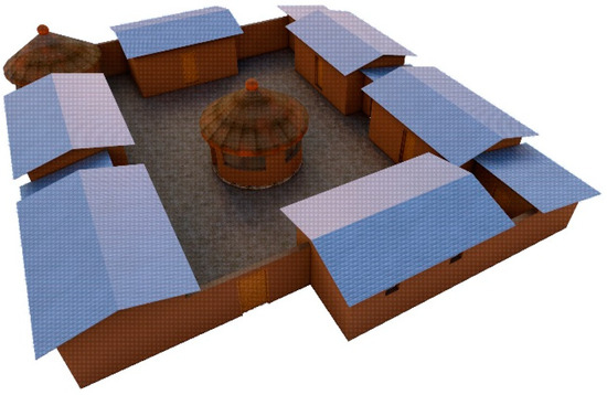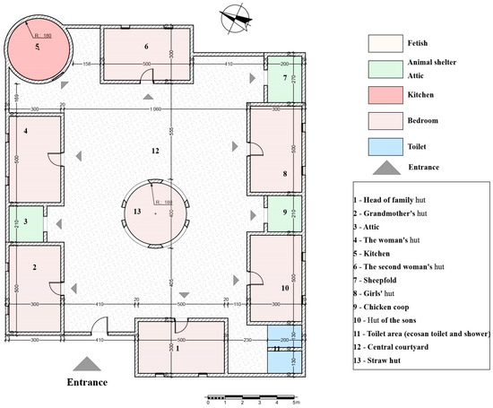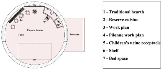 The NVA is structured to meet the functional and social needs of its residents. It consists of two sections. The first, called the HAGA, is the family living area, while the second, called the WAGU, serves as a crop drying area and a gathering space for family gatherings and handicraft activities (Figure 8) [38]. Among the Nawdeba, the vestibule is absent, and the concession is accessed via a main entrance that opens onto the central courtyard, thus optimizing access and circulation between the huts. In the home, the layout of the huts illustrates the social and family structure, and the distribution of spaces is based on social status, age and sex. The head of the family and his wives each have their own space. The children stay with their mothers until they reach the age to have their own dormitory. Each woman has her own kitchen in an enclosed space, but they like to cook outside, in the WAGU space. The crops are stored in large, raised granaries, and chicken coops are built underneath. Open-air sheepfolds are also set up for livestock farming. The relationship between the habitat and traditional beliefs is justified by the presence of ancestral places of worship in the concessions. The bathrooms contain a shower and a urinal and are between two boxes, so that the wastewater is conveyed to manure pits. Toilets are located outside the concessions. The concessions do not benefit from lighting or water supply. Oil lanterns provide lighting, while natural water reserves or community wells provide water.