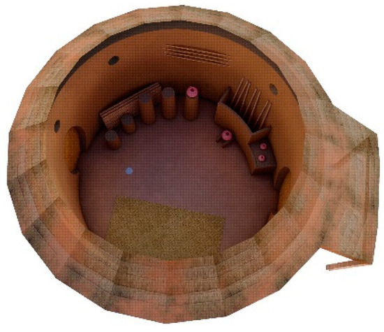 The KVA usually consists of a vestibule, the father’s room, the mother’s room, the children’s dormitory, the granaries and the animal pens, all arranged around a central courtyard (Figure 6 and Figure 7). The entrance to the house is through the vestibule, often the most important room on the property. The vestibule is a versatile space for welcoming guests, settling conflicts, and storing and sheltering animals. In the plots, all the huts open onto a central courtyard used as a place for grouping and drying. The adults each have their own room. Usually, a low terrace for daytime activities separates the women’s room from the outside [36]. Children grow up alongside their mothers before later joining their own huts. Fetishes also find their place in the KVA, because a space is reserved for them, especially for the practice of ancestor worship. All crops are stored in sturdy granaries and the spaces below are often set up for poultry. The sanitary areas contain only a shower and a urinal. They are often arranged between two huts, with openings at the bottom of the fence wall to drain sewage to the manure pits. For other needs, a space is set up outside the concessions. For children, a small hole is made in the women’s hut with ash to collect urine during the night (Figure 8 and Figure 9). Electricity is provided by oil lanterns that illuminate the spaces. The many reserves available in the region ensure the supply of water to households [36].