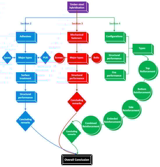 This review paper expands on the key facets of timber–steel hybridisation highlighted above, including the use of adhesives for bonding the timber and steel, mechanical fasteners for connections, and various reinforcement configurations, focusing on how each contributes to enhancing the structural performance. The flowchart in Figure 1 outlines the structure of this paper, which covers the key adhesive types, focussing on epoxy and polyurethane (PUR), alongside the role of bolt and screw mechanical fasteners. Various reinforcement strategies, including top, bottom, side, and embedded configurations, are evaluated for their impact on structural efficiency and fire resistance. By synthesising and quantifying these findings, this paper aims to serve as a valuable decision-making tool, offering guidance to researchers and industry professionals for selecting the appropriate bonding techniques and configurations to meet specific structural objectives and advance sustainable construction practices.