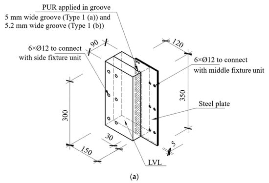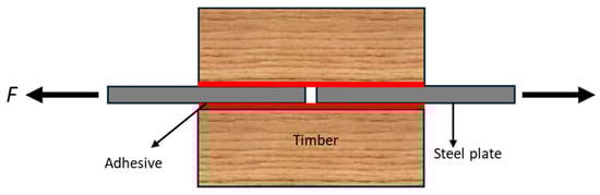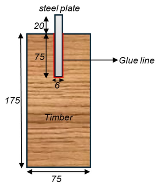 To assess the performances of different adhesives and their formulations in bonding steel to timber, Kemmsies [18] conducted an investigation by manufacturing samples similar to the one depicted in Figure 2. The study evaluated how effectively various adhesives (epoxy, toughened epoxy, and PUR) bonded spruce timber to a 6 mm steel plate at room temperature. The influence of the glue line thicknesses (0.5 mm, 1 mm, and 2 mm) was examined, along with a comparison of timber-cutting methods (circular saw and moulder). The samples were tested in shear using a universal testing machine, which applied an axial load directly to the embedded steel plate. This force acted to pull the plate out of the timber slot, thereby generating shear stress along the adhesive interface. A small gap was maintained between the bottom of the steel plate and the base of the groove in the timber to avoid obstruction and ensure that load transfer occurred entirely through the glue line. The relative slip between the timber and steel was measured using displacement transducers mounted near the glue line, allowing for the evaluation of the adhesive performance under shear loading.