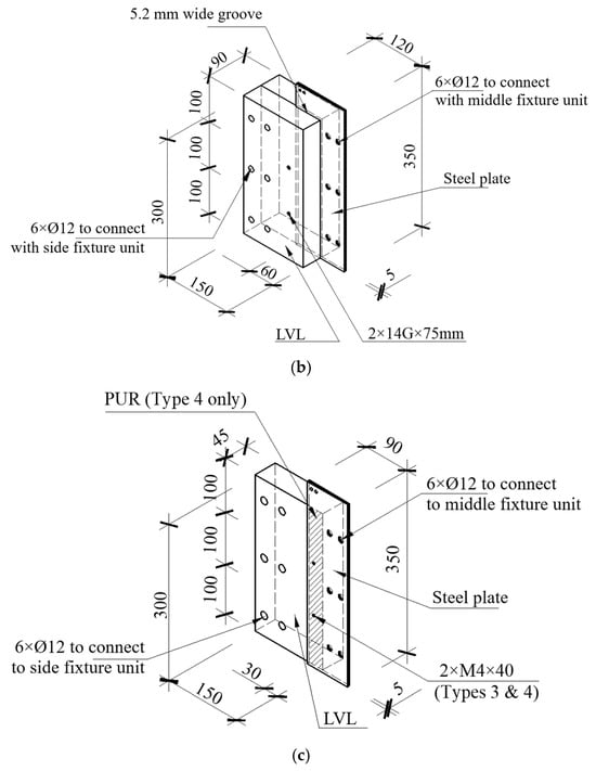 Timber–steel hybrid connections: (a) Type 1; (b) Type 2; (c) Types 3 and 4 (from Gilbert et al. [81]) (all units in mm).