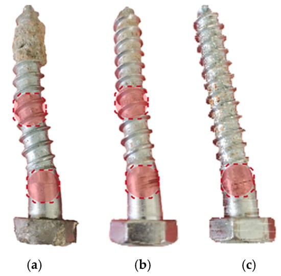 In steel–timber composite connections, the development of plastic hinges in the fasteners enhances the connection ductility. The greater the number of plastic hinges, the higher the connection strength [112,113]. To ensure the formation of double plastic hinges in the mechanical fasteners and thereby increase the connection ductility and peak load capacity, Zhao et al. [114] and Wang et al. [115] proposed anchoring the screw with mortar or adhesive. Zhao et al. [114] conducted a four-point bending test to investigate the efficacy of using mortar and epoxy resin as filler materials to increase the anchorage of screw tips connecting steel I-beams and Douglas fir GLT. These filler materials replaced the timber around the screw tip. Their approach proved effective, as double plastic hinges were formed on the screw in both cases, as seen in Figure 6a,b, increasing the slip stiffness by 48.4% and 18.8% for the mortar and epoxy, respectively, compared to screw connections without anchorage (Figure 6c). Wang et al. [115], through push-out tests, used a fast-curing epoxy resin to increase the anchorage of composite floors composed of I-steel and timber panels. The epoxy resin was found to increase the initial shear stiffness and capacity by 60.0% and 22.8%, respectively, compared to ordinary screwed connections. This concept of anchoring screw tips with filler material to improve the performance was also demonstrated by Zhao et al. [116], where grout was used to anchor the screw tip connecting GLT and I-steel, resulting in increases of 25.2%, 55.9%, and 33.6% in the peak load, initial stiffness, and ductility, respectively. These findings underscore the importance of designing the connection so that the plastic hinge(s) can develop for an enhanced performance in steel–timber composite connections.