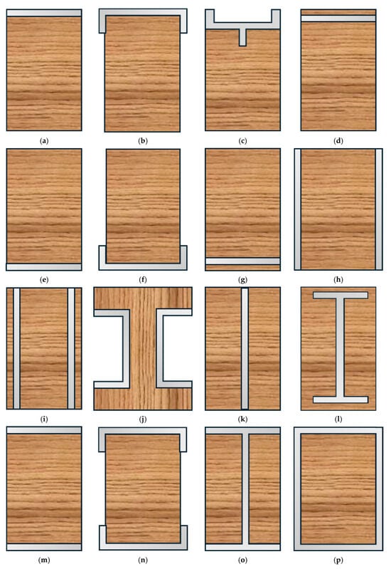 Examples of steel–timber hybrid reinforcement configurations: (a) top flat plate; (b) top U-shaped; (c) top Y-shaped; (d) embedded top; (e) bottom flat plate; (f) bottom U-shaped; (g) embedded bottom; (h) side flat plates; (i) embedded sides; (j) C-shaped sides; (k) embedded middle; (l) embedded I-shape; (m) combined top and bottom flat plates; (n) combined top and bottom U-shaped; (o) combined top, bottom, and embedded; (p) combined top bottom and sides.