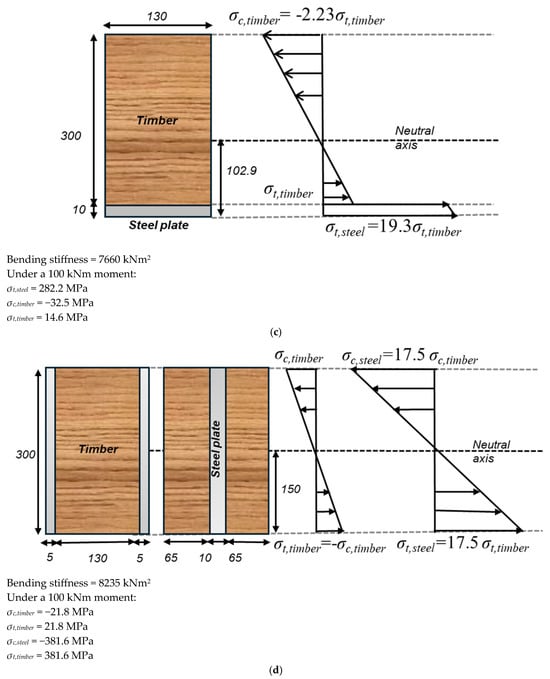 Reinforcement at the bottom of timber beams is typically achieved by attaching or embedding either a steel plate, a channel, or another cross-sectional shape to the underside of the timber beam, as depicted in Figure 7e–g. This configuration has the advantage of improving the following key structural performance criteria: increasing the bending stiffness, enhancing the bending strength, and demonstrating the high potential to improve the ductility [21,27,33,34,38]. Bottom reinforcement overcomes the brittle nature of timber in tension by placing a stiff and ductile material in the tension zone. The neutral axis of the beam is then shifted towards the tension side influencing the stress distribution within the beam. To further illustrate this and demonstrate their similarity to the top reinforcement assumptions, the bending stiffness and stress pattern for the 300 mm deep timber beam reinforced at the bottom by a 10 mm thick steel plate are shown in Figure 8c. The same comments as for the top reinforcement can be drawn but with the stress pattern reversed, i.e., with the maximum compressive stress in the timber now being 2.23 times greater than the maximum tensile stress. This helps delay the onset of brittle failure in the timber. The stress pattern shows that if designed so that yielding develops in the steel (for instance, in the case in Figure 8c, with a steel yield stress (fy) = 250 MPa, which would typically lead to the yielding of the steel before the tensile stress in the timber is reached), combined with the ductile behaviour of the timber in compression, the incorporation of steel has significant potential to enhance the overall ductility of the beam [137].