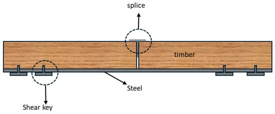 The hybridisation of timber and steel spans various applications, ranging from individual structural elements like beams and columns [8,9] to entire building frameworks [10,11,12], and it extends to timber connections where steel is used for its strength and ductility [13,14,15,16,17]. With a focus on hybrid beams, a critical component of this hybridisation is the bonding between the timber and steel, which enables effective composite action for seamless load transfer, thereby enhancing both strength and stiffness [5]. Studies have investigated various bonding methods, with some focusing on adhesives [18,19], while others have explored mechanical fasteners [5,6]. Additionally, the existing studies have examined the combined use of adhesives and mechanical fasteners to achieve optimal bonding [20,21].
