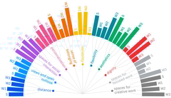For the purpose of conducting the survey in Workspace 3, the legal department from that office required specific adaptations of the WCS. As a result, the third subscale—the sociological dimension of space, consisting of four items related to interpersonal relationships and social dynamics within the company—was removed due to internal corporate constraints. However, the key spatial indicator of sociological relevance—spaces for informal social interaction—remained included and assessed, thereby preserving the spatial validity of the construct. The excluded items were not directly related to spatial characteristics but rather to perceived interpersonal relations, which extend beyond the architectural scope of this study and align more closely with psychological or organizational research. Additionally, the decision to exclude interpersonal relationship questions was shaped by company-specific sensitivities, which may reflect a broader contextual limitation when applying comprehensive tools in real organizational environments. These adaptations, while methodologically justified, are acknowledged as potential limitations affecting the scope of measurement, and they highlight the complexity of implementing spatially grounded instruments in applied workplace settings.