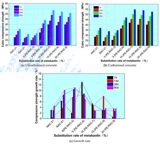 Figure 2 demonstrates the influence of the metakaolin content on the cube compressive strength. As can be observed, metakaolin had a considerable influence on its values. In Figure 2a,b, the strength values show a linear upward trend with a low metakaolin content (<10%), and the change range is large. For example, before carbonization, when the content varied from 0% to 10%, the strength values increased largely by 60.05%, 59.27%, 66.21%, and 70.45%. When the content of metakaolin was less than 10%, the strength value increased linearly with the amount added, and then the opposite trend appeared. It can be determined from Figure 2c that the strength value with a lower content was relatively more sensitive to carbonization and had a greater strength growth rate after carbonization. Based on the above analysis, as the amount of metakaolin increased, its strength value first slowly increased and then decreased, and the optimal content was 10%, which is similar to the optimal content of 15% [,] found in the literature.