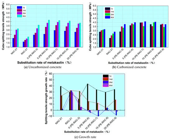Figure 3 exhibits the variation in splitting tensile strength values of TGC with the addition of metakaolin. As can be seen from the figures, when the content was small (<5–10%), the intensity value showed a slow increase. When the content was large, it remained in a stable state and decreased slightly, which is in agreement with patterns found in the existing literature []. Compared with a content of 0%, when its content was 10%, the strength values before carbonization increased by 31.12%. After carbonization for 7 and 14 days, the strength values increased by 34.16% and 12.71%, respectively. In addition, the differences in strength caused by metakaolin in carbonized concrete became smaller under various working conditions. From Figure 3c, due to the influence of carbonization, the partial strength value tended to decrease with the high content. Therefore, in practical processes, the content of metakaolin should be strictly controlled with the recommended incorporation content observed in the literature [] of 10%.