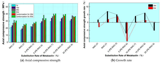 Figure 4 reveals the change in axial compressive strength of TGC. The addition of metakaolin increased its degree of change, that is, metakaolin had a great impact on its axial compressive strength. Compared with recycled concrete (RAC-21), the strength value with the 10% content increased by 67.83%, 76.38%, 60.67%, and 57.12% before carbonization, and the corresponding value increased by 56.09% and 54.44% after carbonization. When the content of metakaolin was approximately 10%, TGC’s axial compressive strength reached its maximum under various working conditions. Above that, the addition of metakaolin made TGC’s strength relatively stable and even caused a decreasing trend, which was similar to results from the literature []. The reason was that the excessive addition of metakaolin replaced part of the cement and changed the composition of the cementitious material, resulting in the difference in its axial compressive strength.