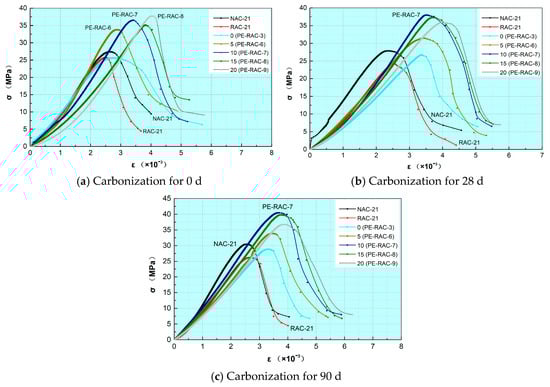 Figure 5 reflects the influence of carbonization on concrete mixed with metakaolin. As can be seen, compared with NAC, metakaolin significantly increased the peak stress of concrete, which was exactly opposite that of the elastic modulus. The inflection point of its falling section was more obvious than that obtained when adding RCAs alone (RAC-21), which is consistent with the results of the regeneration of modified recycled concrete [] and RAC with MK []. The test block had better deformation performance, also indicating that when adding IOTs and WPF together with MK, its strength and deformation properties were greatly improved, which could meet the requirements for concrete performance in daily engineering practice.