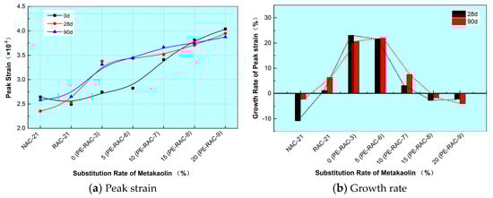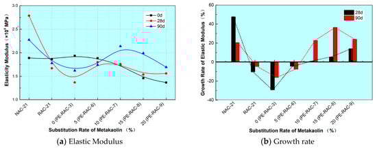 Figure 6 and Figure 7 exhibit the denaturation performance curves of concrete with metakaolin under different carbonization cycles, and the curves are fluctuating as a whole. According to Figure 6, with the addition of metakaolin, its peak strain increased steadily with a low growth rate. The higher the content, the smaller the influence of carbonization age, and the longer the carbonization period, the gentler the curve. When its dosage changed from 5% to 20%, the peak strain increased by 22.79%, 12.71%, and 6.27% with carbonization for 0 d, 28 d, and 90 d, respectively, which indicated a similar trend as that in the literature (Mukharjee et al., 2019) []. It can also be seen in Figure 7 that carbonization made its elastic modulus fluctuate in varying degrees, and the longer the carbonization cycle, the greater the fluctuation. When the content was large (>10%), the fluctuation tended to gradually become gentle. On the whole, metakaolin improved the concrete’s elastic modulus, but it was still lower than that of ordinary concrete (NAC-21).