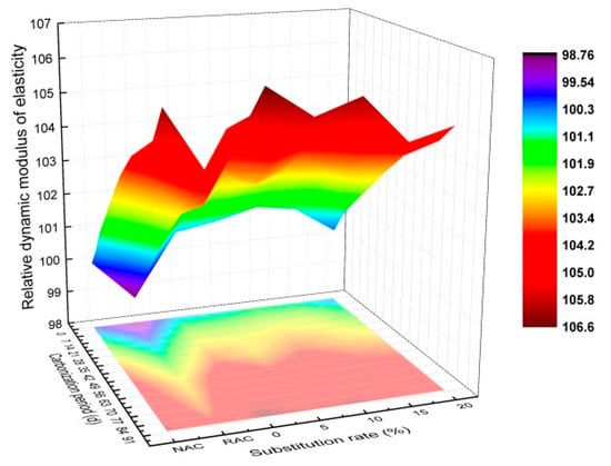 Based on the different propagation speeds of ultrasonic waves inside concrete, the microscopic changes in the structure can be reflected through the macroscopic value without damaging the structure, which is the so-called ultrasonic nondestructive testing. One probe is used to transmit ultrasonic waves, and the other probe receives ultrasonic waves, and the wave speed is determined by the propagation time, thereby indirectly reflecting the damage inside the concrete. We tested the concrete using the relevant method and calculation process as shown in the specification GB/T50082-2009 []. For a more convenient analysis, the relative dynamic elastic modulus (RDEM) was calculated, and the fundamental frequency value of the corresponding block with 0 d of carbonization was adopted for the initial value. The values of the RDEM after calculations are shown in Figure 8. From the figure, the values of the RDEM increased slightly with the carbonization period. When the carbonization period was 90 days, its maximum value occurred when the content of metakaolin was 5%. Compared with NAC-21 and RAC-21, the values increased by 6.14% and 4.85%, respectively. According to the corresponding equipotential curve, the RDEM of RAC was the smallest. Due to the presence of recycled mortar, the matrix structure of RAC was the most porous, which also led the RDEM value to be minimum.