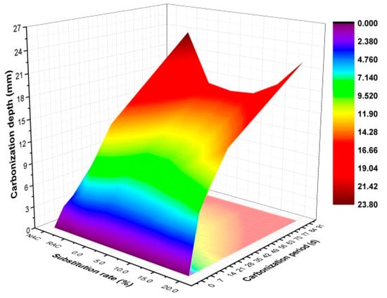 As shown in Figure 9, the carbonization depth showed the same trend with the increase in carbonization age. Under the same carbonization age, the carbonization depth of RAC was significantly greater than that of NAC, indicating its poor carbonization resistance. As a mineral admixture, metakaolin exhibits chemical reactivity, interface reinforcement, and micro-aggregate reaction []. The chemical reactivity is mainly due to its strong activity. By promoting the hydration reaction of cementitious materials, the alkali content in concrete is reduced to a great extent. Interface enhancement occurs because metakaolin can fill the pores at the interface, strengthen the weak area of its interface, then make this zone firmer. The micro-aggregate reaction is mainly due to its fine particles, which can fill the harmful pores inside concrete and effectively reduce its porosity. Generally, the first characteristic is not conducive to the improvement in carbonization resistance, while the latter two enhance carbonization resistance.