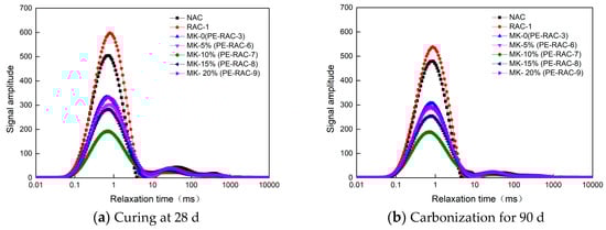 Figure 10 and Table 6 demonstrate T2 relaxation curves and relevant characteristic data points obtained by NMR technology. As can be seen, with the addition of metakaolin, the pore structure of concrete changed to a great extent. When its content increased from 0% to 20%, the amplitude decreased by 10.52%, 47.21%, 17.32%, and 6.61%, which was smaller than that of NAC-21 and RAC-21. When its content reached 10%, its amplitude decreased considerably, by 62.03% and 67.95%, respectively. A similar situation occurred after carbonization for 90 days. The porosity of concrete under various working conditions was reduced by different procedures due to carbonization. It also demonstrated that metakaolin could greatly reduce the number of pores in concrete, which is mainly due to its pozzolanic activity reaction, hydration promotion reaction, and filling effect. The layered aluminum silicate compound in metakaolin allows free water to enter the pores between the layers, forming a unique “internal curing” environment, continuously filling and dividing the internal pores, and reducing the diameter of the pores, so as to achieve the purpose of optimal structure. An appropriate amount can greatly lower its peak amplitude, but when its amount is large, the number of pores rises again. When its amount was increased to 20% (PE-RAC-9), compared with the 10% content, the amplitude increased by 73.51%, and the effect on the number of pores was quite serious.