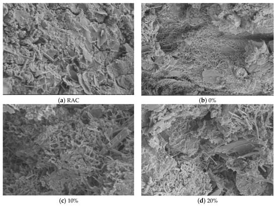 Figure 11 shows its SEM microstructure after carbonization for 0 d under the action of RAC-21 and with 0%, 10%, and 20% of metakaolin.