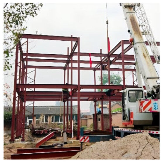 China is one of the countries most severely affected by seismic activity worldwide. Destructive earthquakes mostly occur in rural areas, where buildings are vulnerable to seismic disasters, leading to collapsed houses and casualties []. Prefabricated components of light steel composite frame structures (Figure 1) are lightweight, possess good seismic resistance, and are easy to construct. They can effectively enhance the seismic performance of rural residences in China [,].