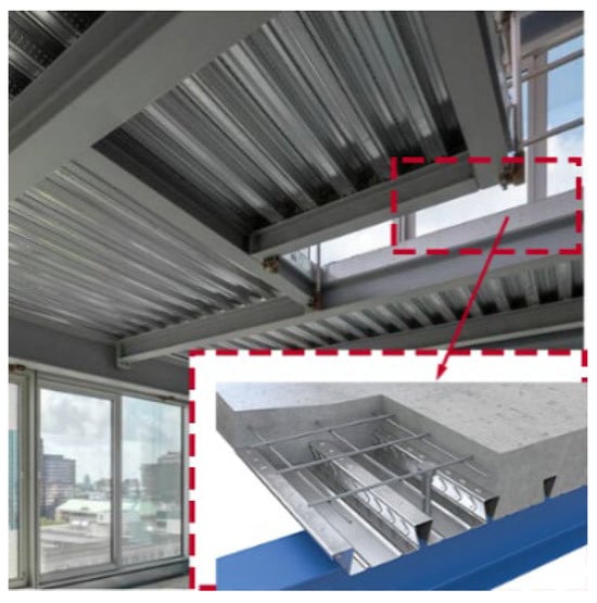 Composite steel deck slabs are commonly used in prefabricated light steel composite frame structures. These slabs consist of profiled steel sheets and concrete that work together and deform in a coordinated manner through the use of shear connectors (Figure 2). Porter and Ekberg [] conducted 353 full-scale tests to study the typical failure modes and mechanical behaviors of floors, finding that the primary failure mode of composite floors is shear–bond failure. Daniels and Crisinel [], using a combination of node testing and numerical calculations, identified that the shear–span ratio is a critical factor affecting the longitudinal shear capacity of composite floors. Tenhovuori and Leskela [] concluded that thicker composite floors and smaller shear spans result in higher longitudinal shear capacities. Marciukaitis et al. [] proposed methods to calculate the deflections of composite floors under different bending limit states.