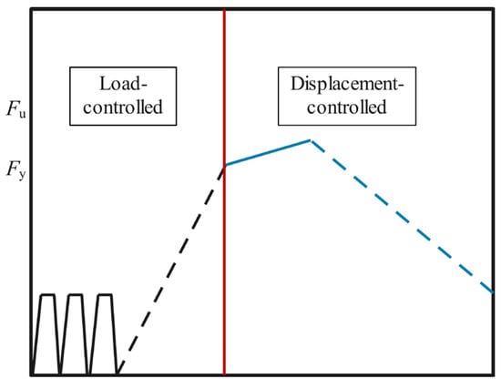 In the first stage, load-controlled loading was performed with a rate of 1 kN/s, increasing by 15 kN per stage, with each stage maintained for 5 min. Surface cracks on the concrete slab were monitored and documented during this phase. When the load-displacement curve reached the yield load (Fy), the loading method transitioned to displacement-controlled loading. In this stage, the rate was set at 0.1 mm/min, with increments of 0.5 mm per stage, and each stage held for 5 min while observations of the test phenomena continued. The test concluded when the specimen experienced sudden failure or when the capacity dropped to 85% of the ultimate load. The load at this failure point was recorded as the failure load. The loading protocol is illustrated in Figure 8, where Fu represents the ultimate load and Fy represents the yield load.