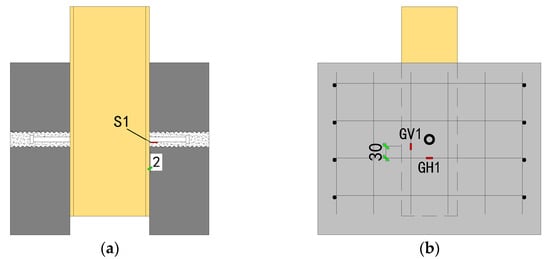 For stress analysis, strain gauges were strategically placed on the specimen, as illustrated in Figure 10. A strain gauge, labeled S1, was attached to the end of the underside of the single-sided stud. Additionally, strain gauges GV1 and GH1 were positioned on the steel mesh near the stud, measuring vertical and horizontal strains, respectively.