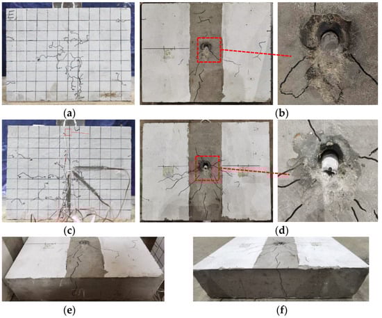 Failure phenomenon of B19-C40-G80-D40-b: (a) Exterior surface of concrete slab on the east side; (b) Inner surface of concrete slab on the east side; (c) Exterior surface of concrete slab on the west side; (d) Inner surface of concrete slab on the west side; (e) Bottom surface of concrete slab on the east side; (f) Bottom surface of concrete slab on the west side.