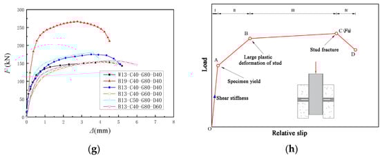 The load–slip curves of all specimens exhibit a similar trend, which can be broadly divided into four stages (Figure 14h):