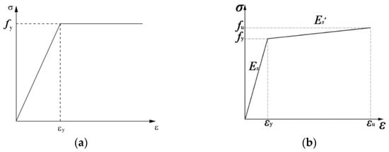 The H-beams used in the study are of HM 200 mm × 150 mm × 6 mm × 9 mm specification, with flange and web thicknesses of 9 mm and 6 mm, respectively. The embedded perforated steel plates have a thickness of 3 mm, as illustrated in Figure 6a. The studs, which have diameters of 13 mm and 19 mm and a length of 100 mm, were made from ML15 steel, as shown in Figure 6b. The longitudinal and stirrup reinforcements in the concrete slabs are HRB335 steel bars with a diameter of 10 mm. The corrugated metal pipes, made of galvanized Q195 steel, have diameters of 40 mm and 60 mm with a wall thickness of 0.5 mm, as shown in Figure 6c. The mechanical properties of the H-beam steel, studs, and reinforcements are determined following the standards for “Metallic materials—tensile testing—part 1: method of test at room temperature” []. The steel mechanical performances of the specimens are shown in Table 2. The yield strength and elastic modulus of the corrugated metal pipes, as provided by the manufacturer, are 195 MPa and 2.01 × 105 MPa, respectively.