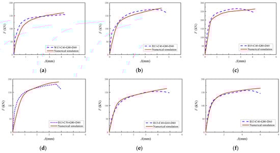 Comparison of load–slip curves: (a) W13-C40-G80-D40; (b) B13-C40-G80-D40; (c) B19-C40-G80-D40; (d) B13-C50-G80-D40; (e) B13-C40-G60-D40; (f) B13-C40-G80-D60.
