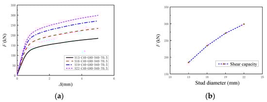 Influence of stud diameter on the shear capacity of joints: (a) Load–slip curves; (b) Shear capacity analysis.