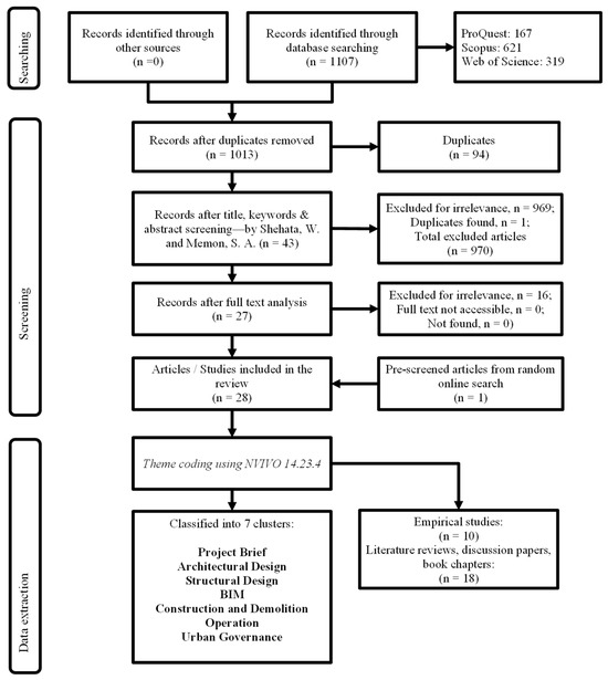 Researchers undertook a preliminary full-text content analysis of the 43 articles and assessed them against the eligibility criteria. The primary criterion for qualifying was that the article must disclose an insight into the AECO industry’s perspectives on GenAI. After the full text content analysis, 16 unrelated articles were removed, and 1 article was added from a general search over the internet by the research team based on relevance to the topic. In total, 28 articles were retained for analysis.