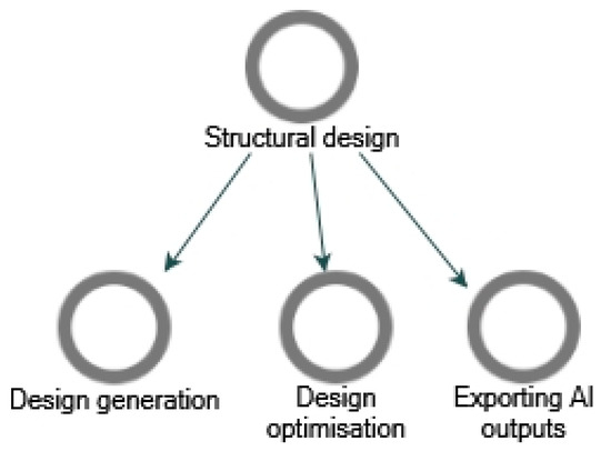 Figure 5 presents a structural design thematic tree, and the literature points to the role of GenAI in structural design generation, optimisation, and exporting outputs. The literature points to improved results of structural design when GenAI tools are provided with technical specifications about the design [7]. For example, Qin et al. [36] produced a shear wall system design using a large language model (LLM) and GenAI in structural design. In their research, the shear wall design was generated and optimised in an iterative process, ensuring structural safety and cost-effectiveness, significantly reducing the design outcome’s material consumption and improving the design efficiency. Liao et al. [14] identified the role of GenAI in design optimisation by learning from existing structural designs. Qin et al. [36] postulated a two-stage design optimisation method based on rules, such as material consumption and performance criteria. They pointed out that the design can be exported to computer-aided design tools for subsequent modification, analysis, and verification. Rafizadeh et al. [37] also briefly mentioned the role of GenAI in structural design optimisation. The potential for GenAI tools in the structural design process heavily relies on the specific type of tool and the technical design specification offered.